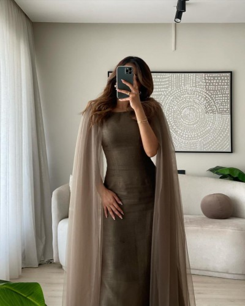 - اسم المنتج: فستان سهرة كتان بأكمام كايب وتل