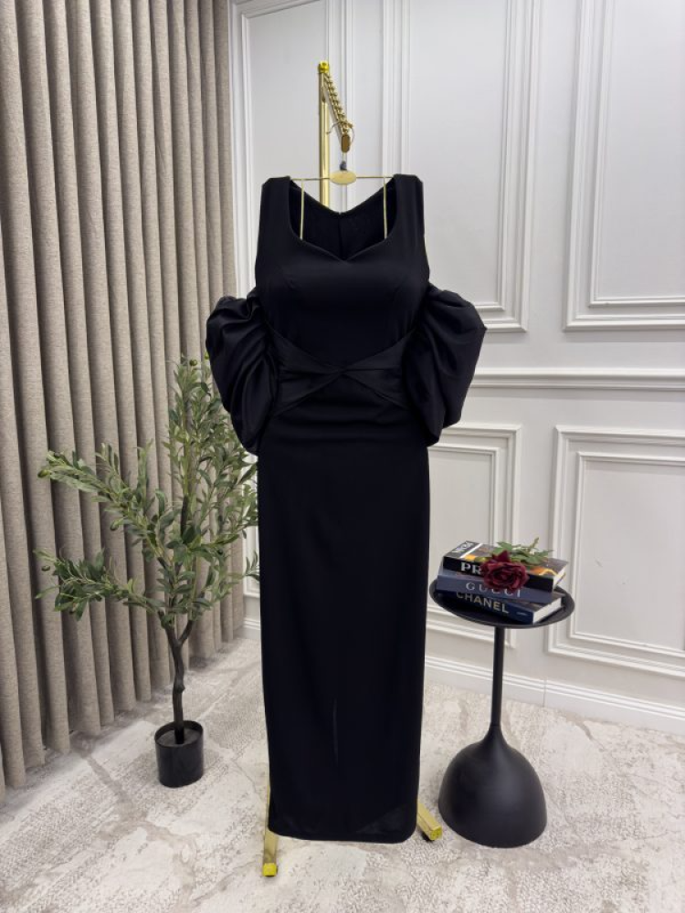 - اسم المنتج: فستان سهرة اسود بأكمام فاخرة